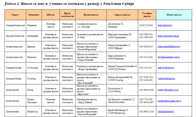 Tabela 2. Škole za decu i učenike sa smetnjama u razvoju u Republici Srbiji